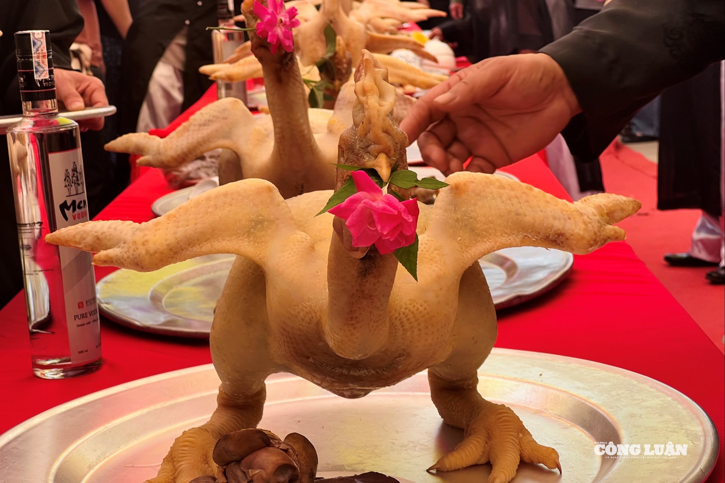 Gà dùng trong thi phải là gà trống nặng từ 4kg trở lên, với mào đỏ, chân móng khỏe, thường là giống gà Hồ hoặc gà Đông Tảo để đảm bảo kích thước và độ “đứng dáng” khi đặt trên mâm.
