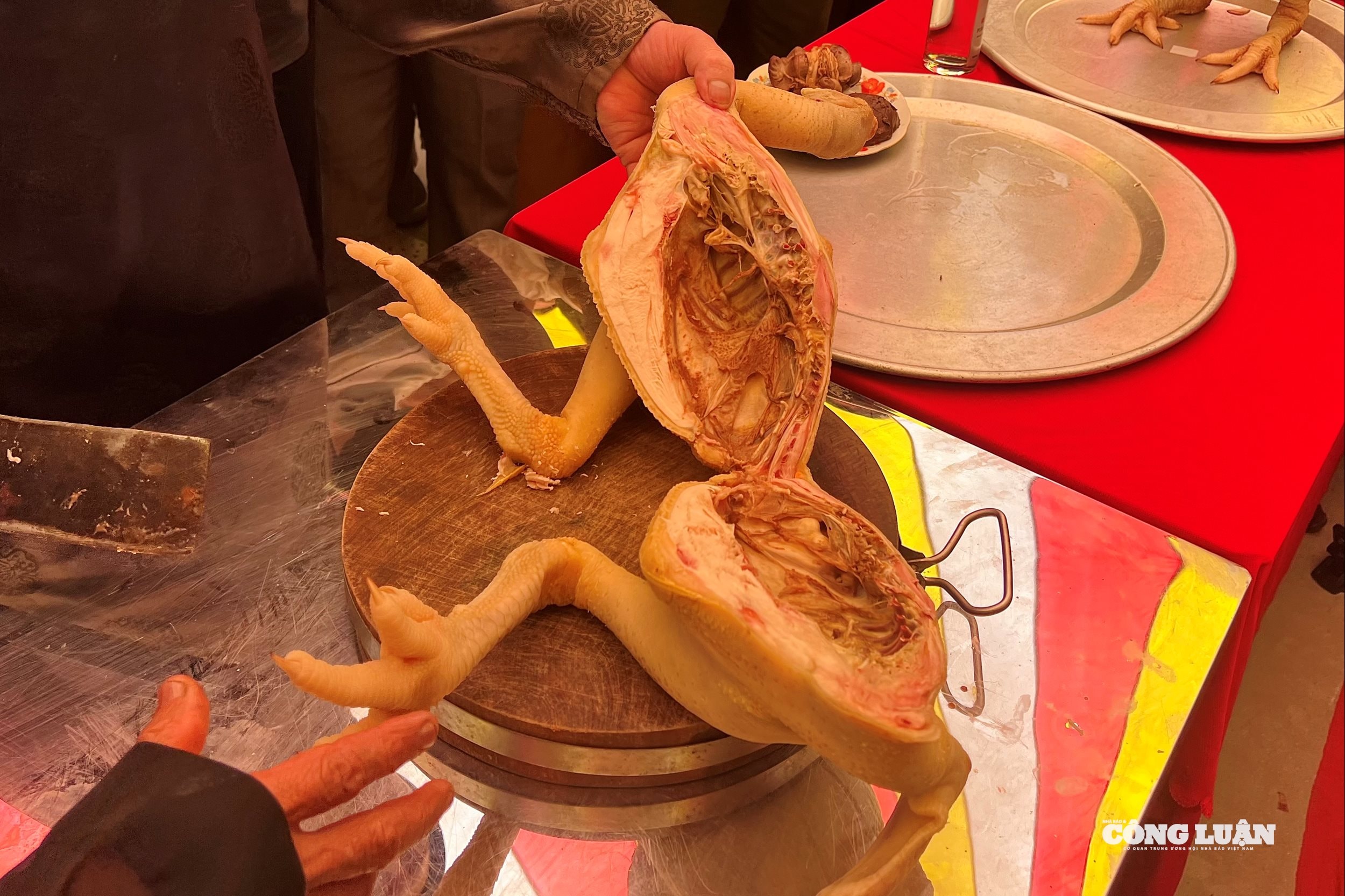 Theo ông Tâm, việc lựa chọn và chế biến gà được đặt ra những tiêu chí rất khắt khe, trong đó “nhất dáng, nhì da, thứ ba là sống chín”. Điều này đòi hỏi con gà không chỉ có hình thức đẹp, dáng đứng vững mà còn phải đảm bảo màu da vàng đều, thịt chín kỹ, thể hiện sự chỉn chu và tôn kính trong lễ dâng.
