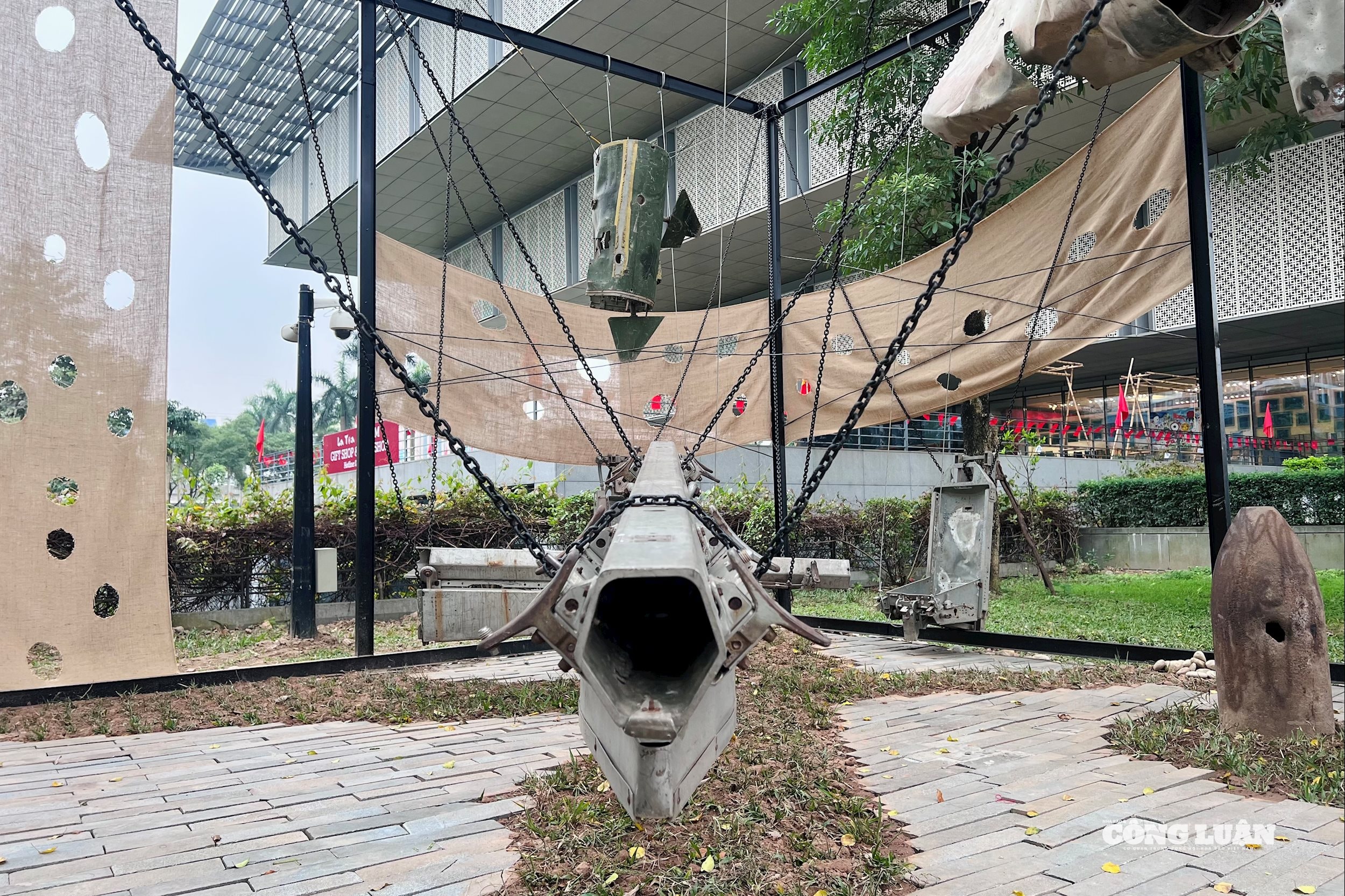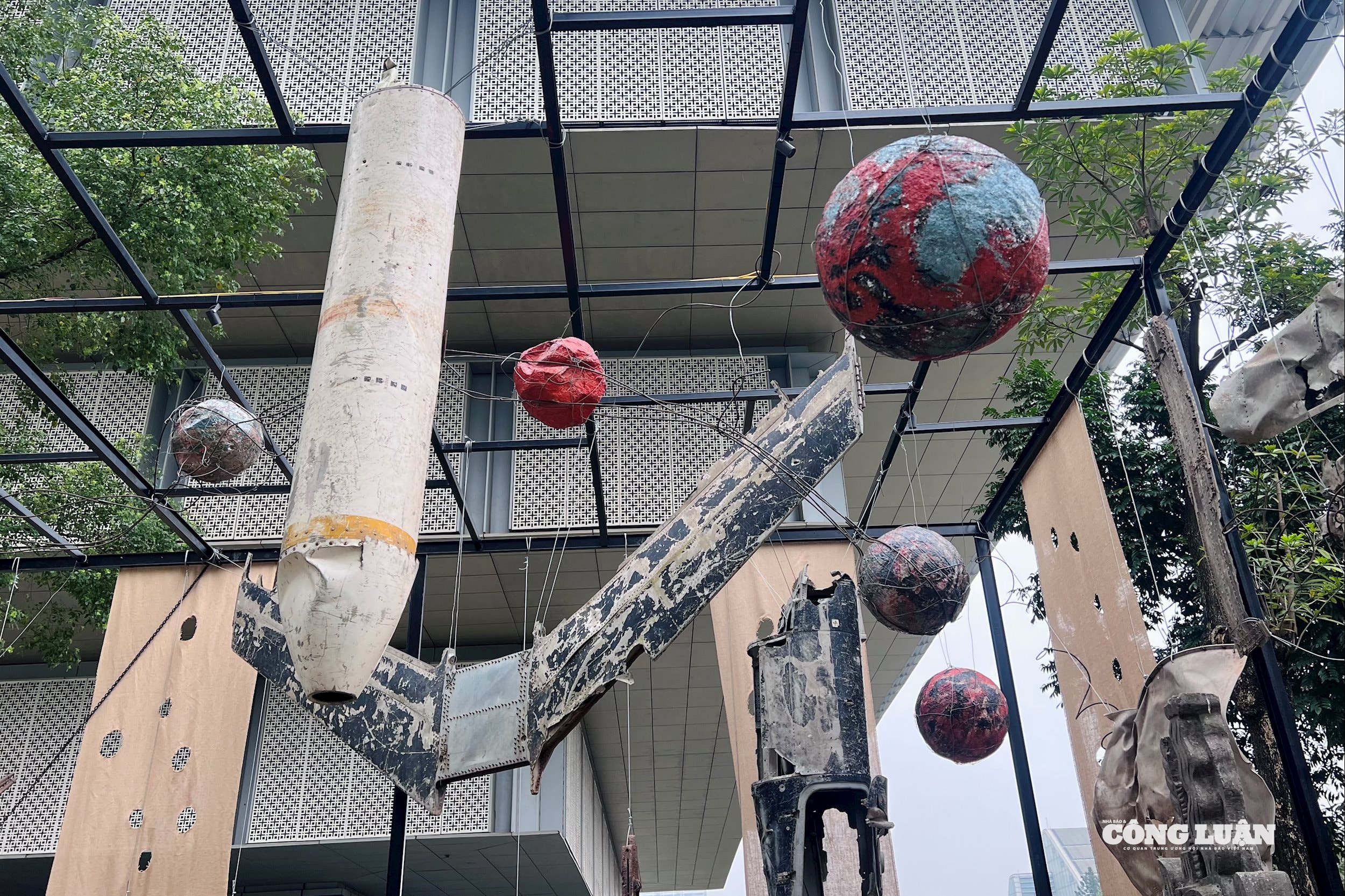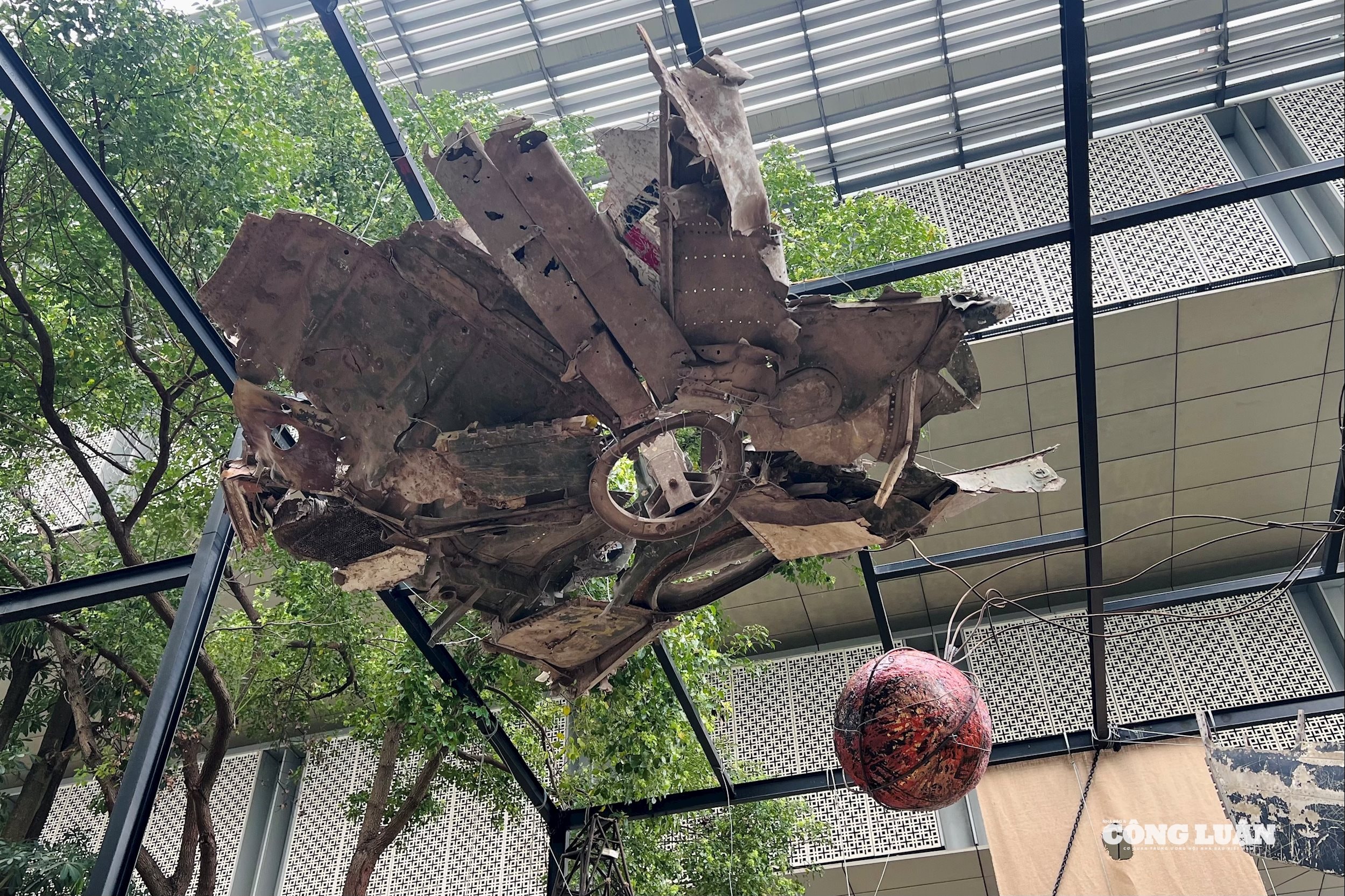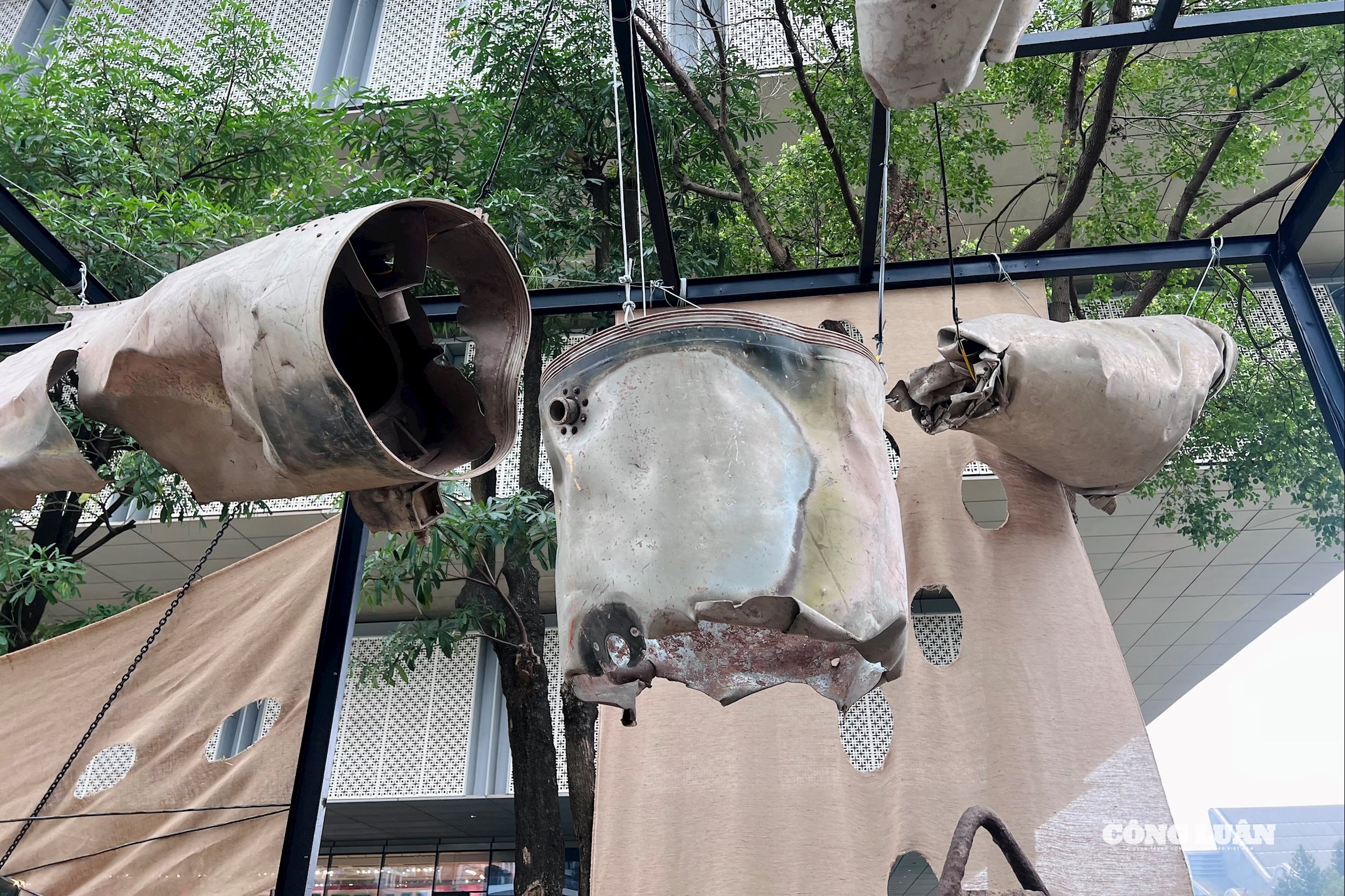 Trong khu trưng bày ngoài trời của Bảo tàng Hà Nội, những mảnh kim loại từng thuộc xác máy bay và vỏ bom được treo lơ lửng trong cấu trúc sắp đặt nghệ thuật. Cách trưng bày mới khiến người xem không chỉ nhìn hiện vật như chứng tích của chiến tranh, mà còn cảm nhận chúng trong một không gian thẩm mỹ giàu tính biểu đạt.