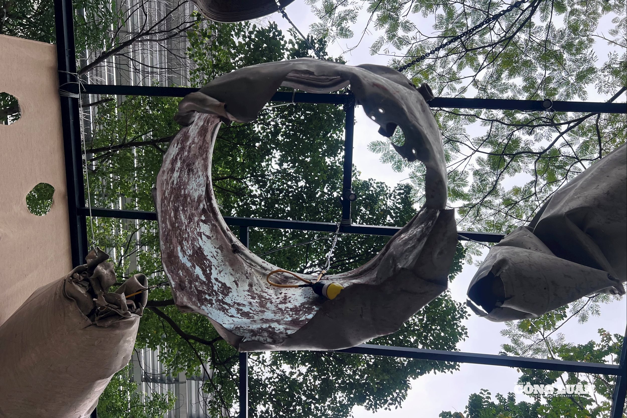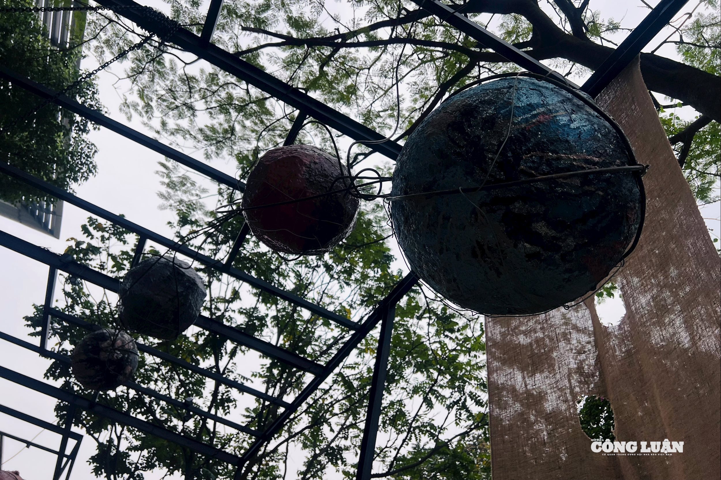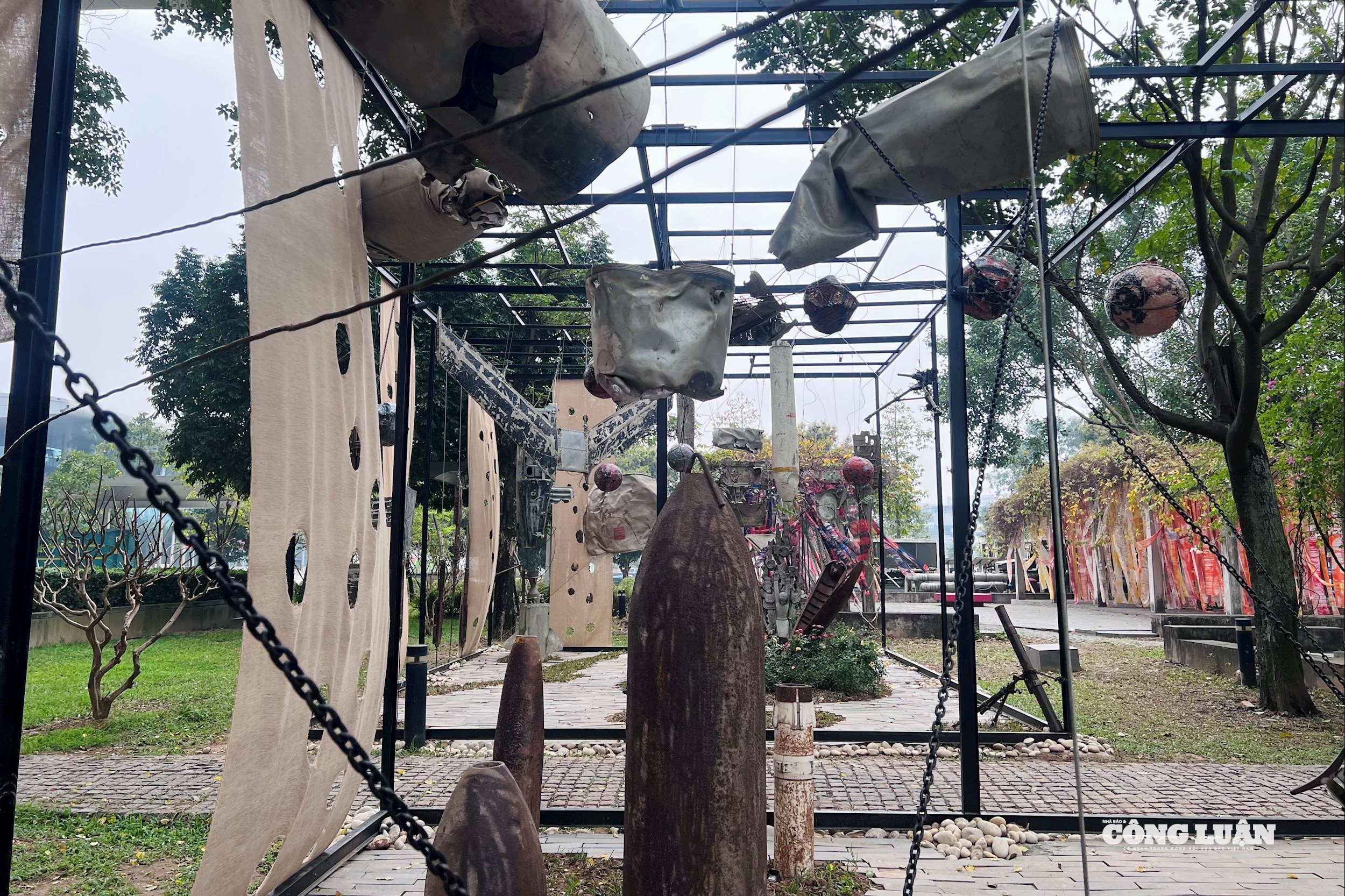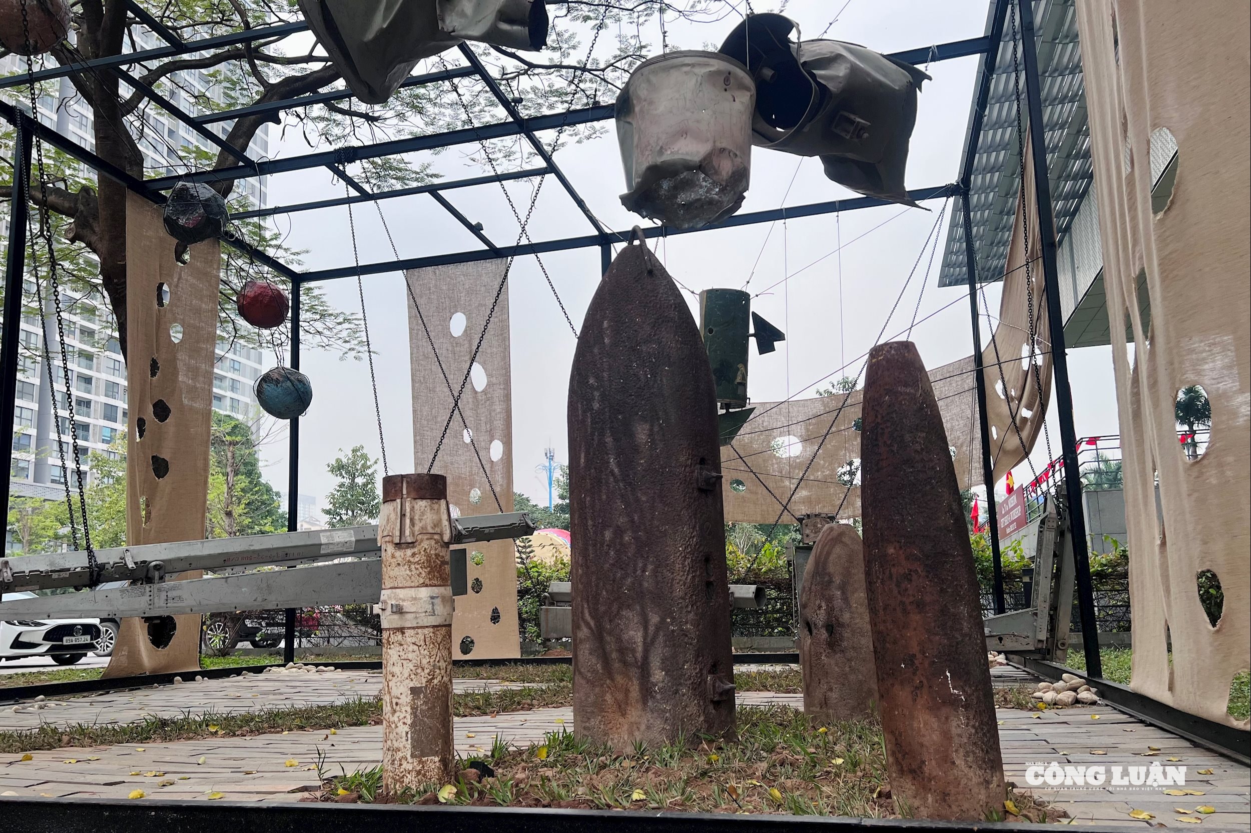 Trong khu trưng bày ngoài trời của Bảo tàng Hà Nội, những mảnh kim loại từng thuộc xác máy bay và vỏ bom được treo lơ lửng trong cấu trúc sắp đặt nghệ thuật. Cách trưng bày mới khiến người xem không chỉ nhìn hiện vật như chứng tích của chiến tranh, mà còn cảm nhận chúng trong một không gian thẩm mỹ giàu tính biểu đạt.